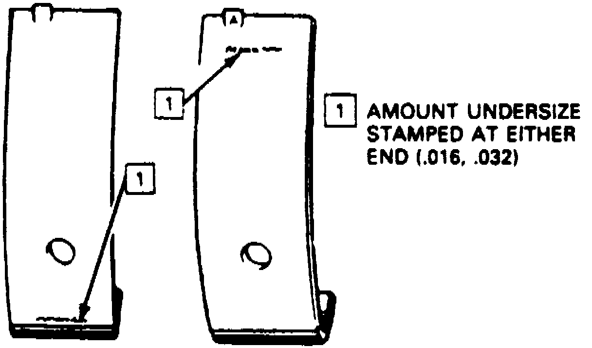 Connecting rod and main bearing are of the precision insert type. They are available for service use in standard and two undersizes of .016 and .032 inch. Bearing undersize amount is stamped at either end of the bearing, Fig. 16 .