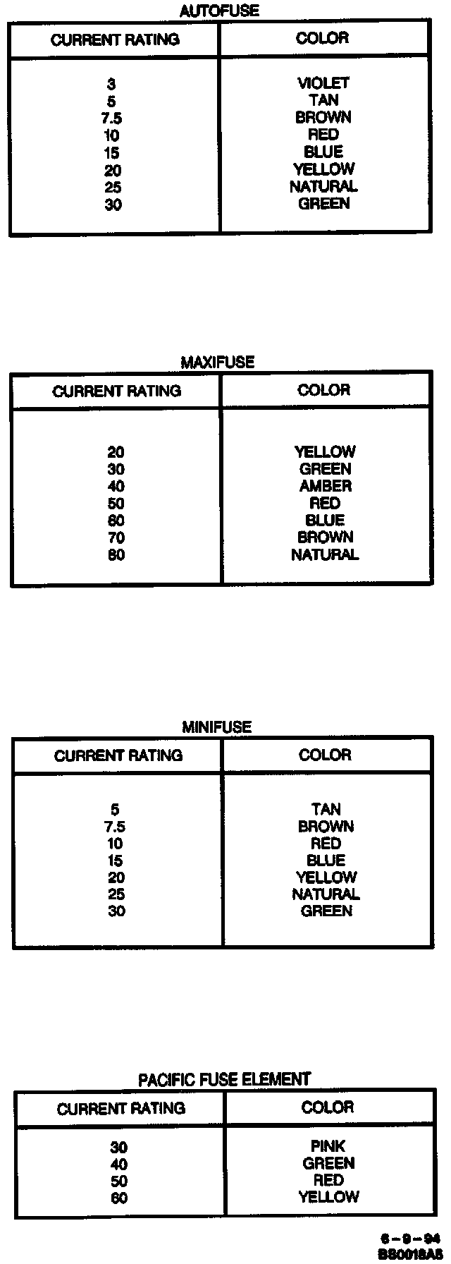 Fuses are color coded. The standardized color identification and ratings are shown. For service replacement, non-color coded fuses of the same respective current rating can be used.