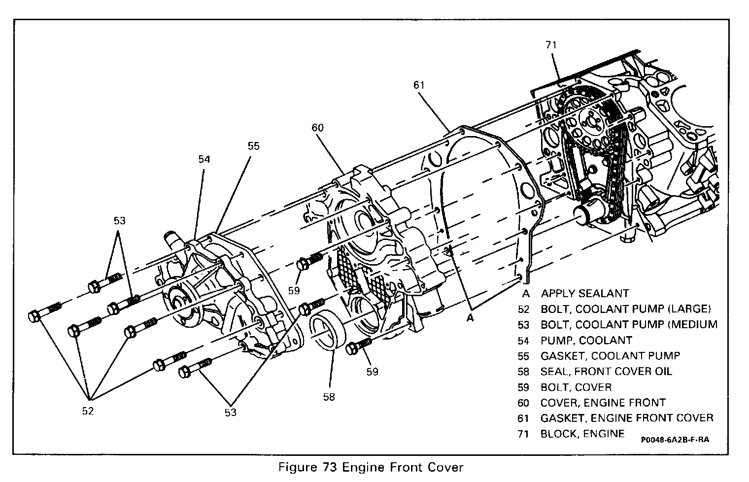 - Uniformly coat both sides of the lower tabs of the front cover gasket (61) with sealer GM p/n 1052080.