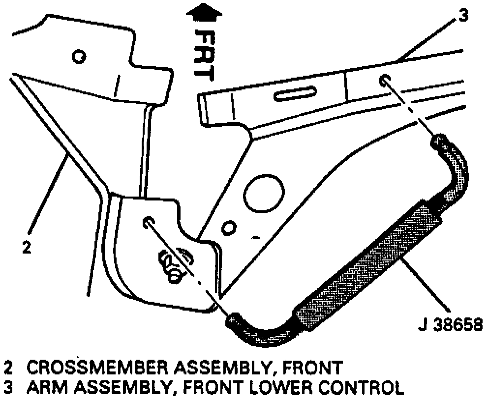 2. Loosen front lower control arm nuts, then install camber/caster adjuster tool No. J 38658, or equivalent, to slot holes in lower control arm and front crossmember, Fig. 1.