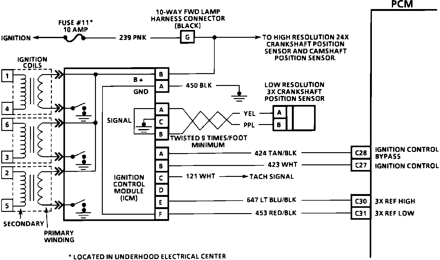 The Crankshaft position sensor provides the PCM with a signal to calculate RPM and crankshaft position.
