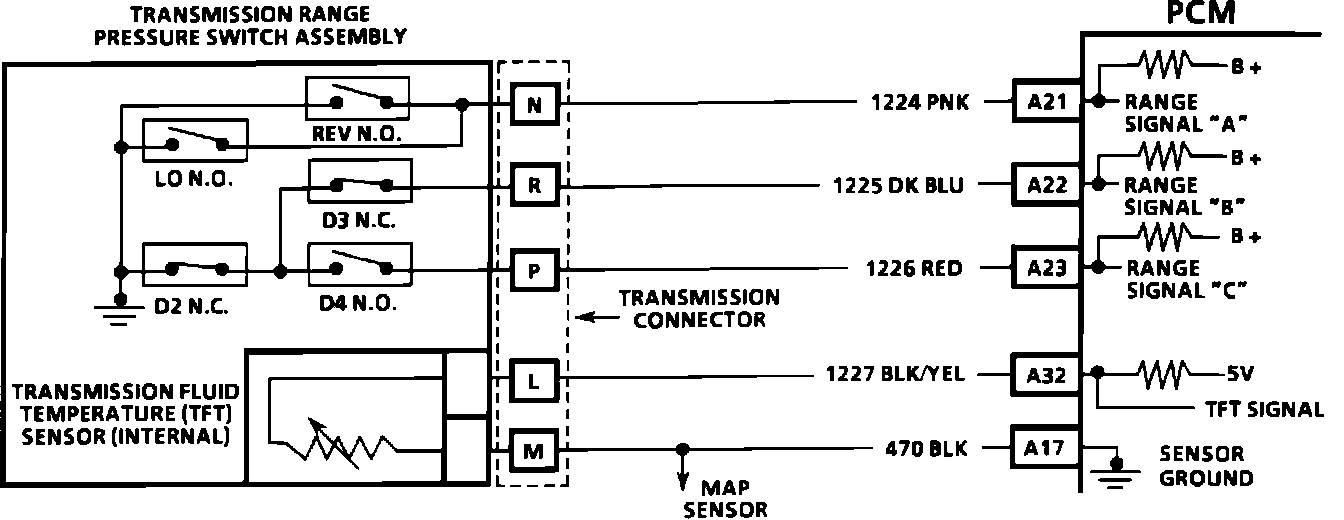 Five pressure switches, two normally closed and three normally open, detect fluid pressure within the valve body passages. The combination of pressure switch state determines voltage signal, B+ or 0, on each range signal to the PCM.