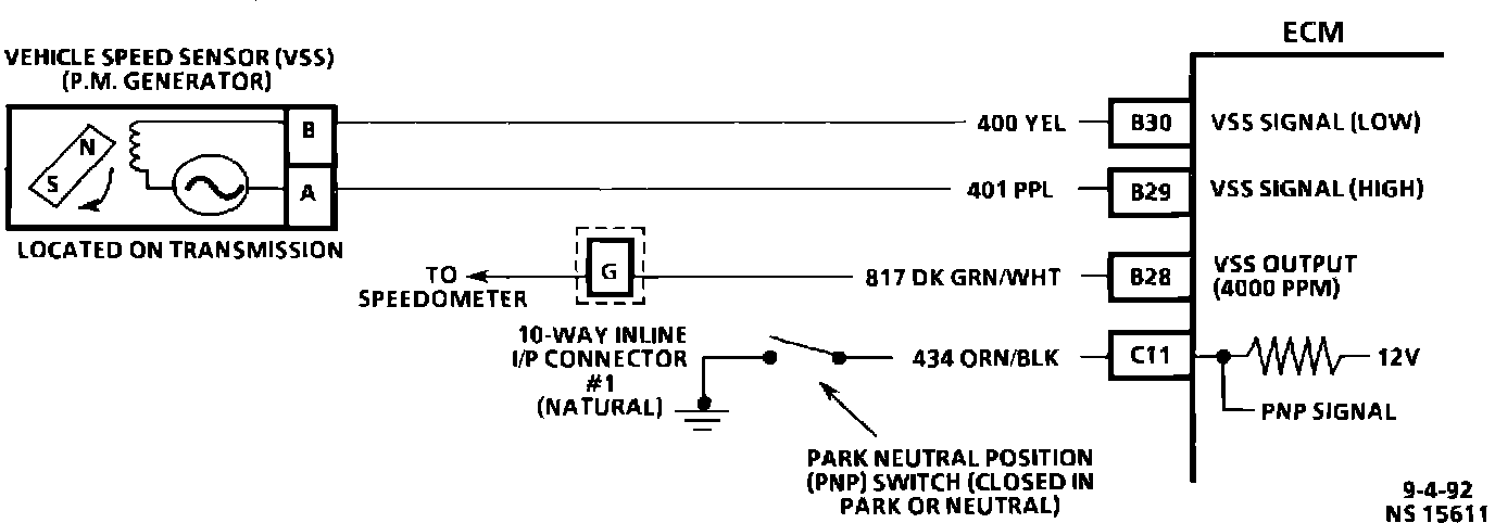 The VSS produces an A/C voltage signal that increases with vehicle speed. The ECM supplies the necessary signals to the instrument panel and utilizes the information to control the TCC and shift solenoids.