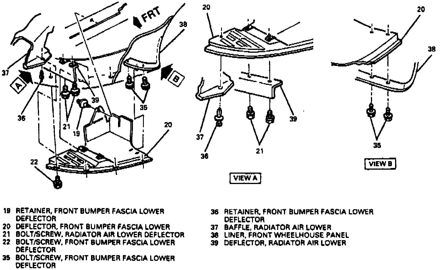 c. Remove retainers from front lower deflector and radiator lower baffle.