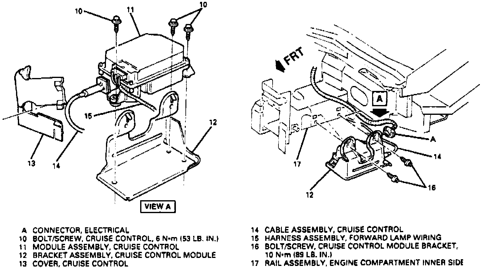 b. Torque cruise control module to left engine compartment inner side rail screws and bolts to 89 ft. lbs.