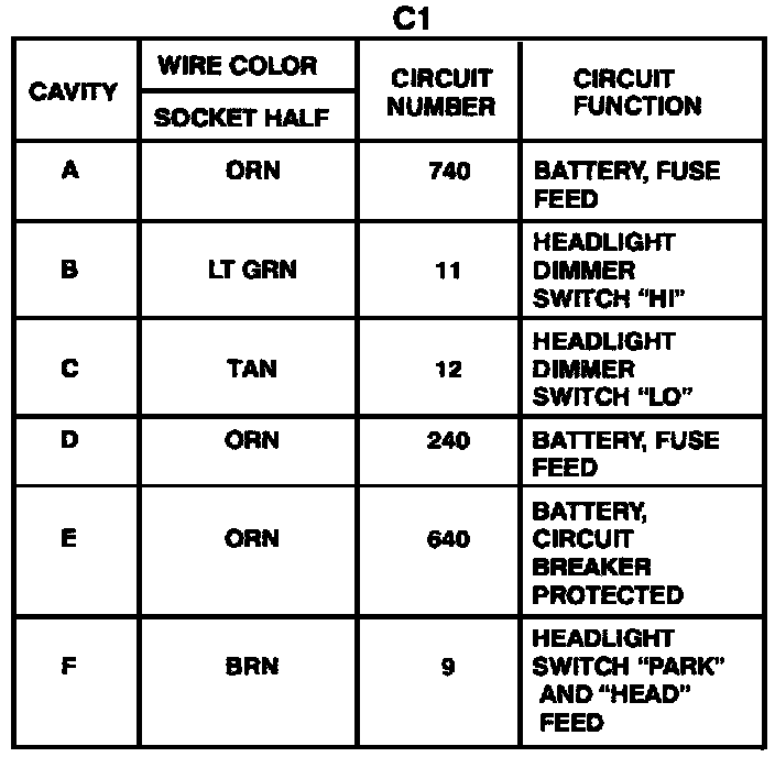 Harness Connector Faces: Turn/Hazard-Headlight Switch Assembly- C1 (Description):