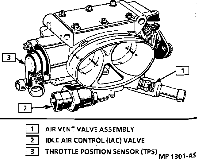 The Throttle Position Sensor (TPS) is connected to the throttle valve shaft in the throttle body unit. The TPS is a potentiometer with one connection to ground, and the other to the computer 5.0 volt reference source. A third wire from the computer is used to measure the output voltage from the TPS. As the throttle angle changes (pressing down on accelerator pedal) so does the TPS voltage output. Each voltage value corresponds to a specific throttle angle. The computer monitors this voltage, calculates the throttle valve angle, and uses this information, compared with information from other engine sensors, to determine engine load and regulate fuel injection and ignition timing.