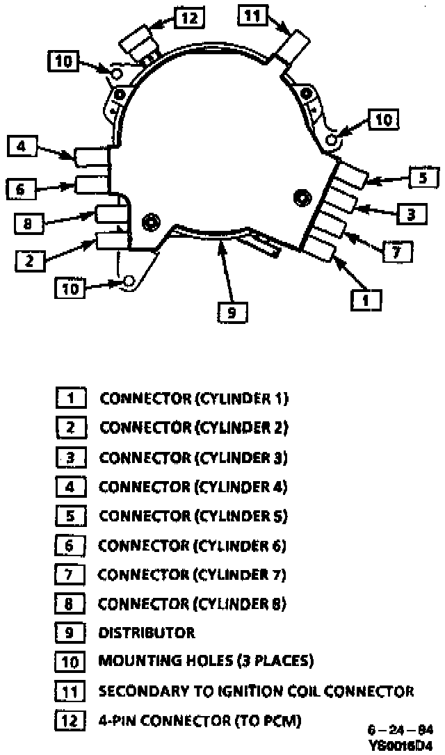 The distributor also contains a signal disk and two optical camshaft position sensors that provide signals to the PCM for timing control. One sensor senses 360 equally-spaced slots in the signal disk to provide 720 signals per camshaft revolution for high-resolution timing control. The other optical sensor senses 8 disk slots of variable length, providing a low-resolution signal that tells the PCM which spark plug is being fired. Power for the optical sensors, a system ground, and the two sensors signals are transferred between the PCM and the distributor through a shielded harness connected to the 4-terminal connector on the distributor.