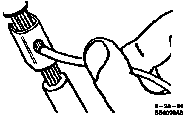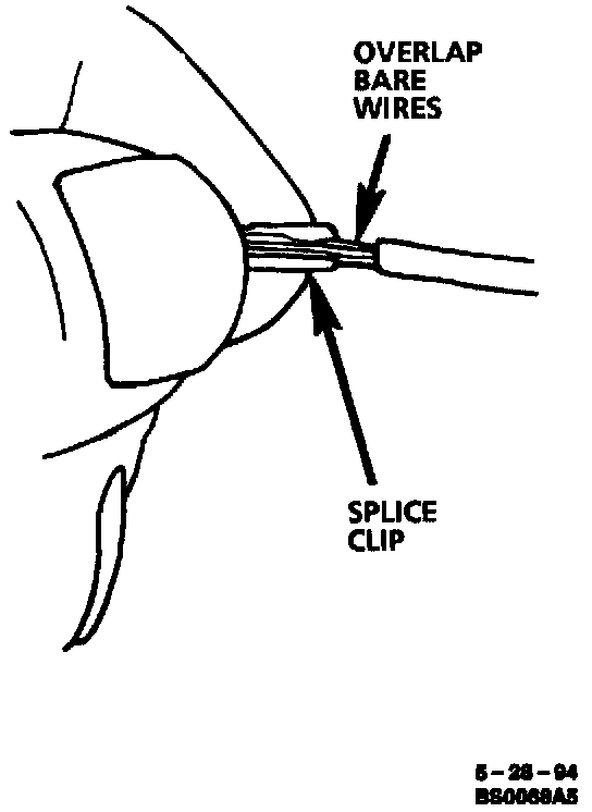 Select the proper clip to secure the splice. To determine the proper clip size for the wire being spliced, follow the directions included in the J 38125-A Terminal Repair Kit Select the correct anvil on the crimpers (On most crimpers your choice is limited to either a small or large anvil.) Overlap the stripped wire ends and hold them between your thumb and forefinger as shown. Then, center the splice clip under the stripped wires and hold it in place.