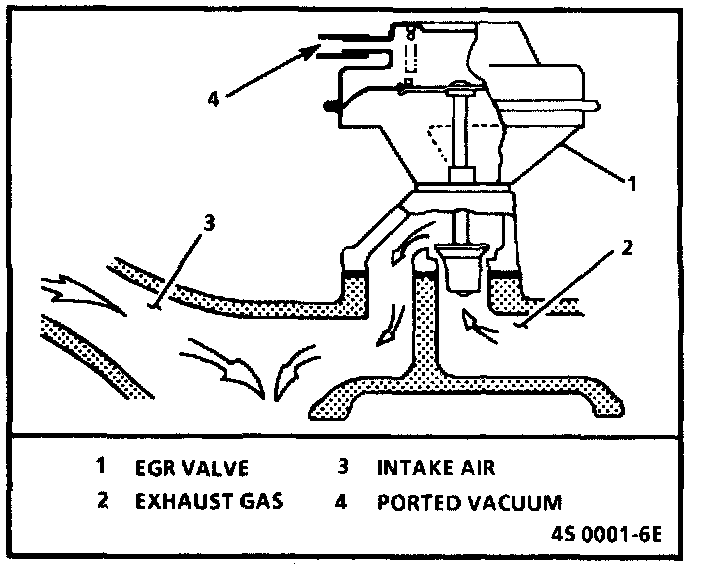 The EGR valve is opened by ported vacuum to allow exhaust gas to flow into the intake manifold. The exhaust gas then flows with the air / fuel mixture into the combustion chamber. If too much exhaust gas enters, combustion may not occur. For this reason, very little exhaust gas is allowed to pass through the valve, and none at idle, or wide open throttle.