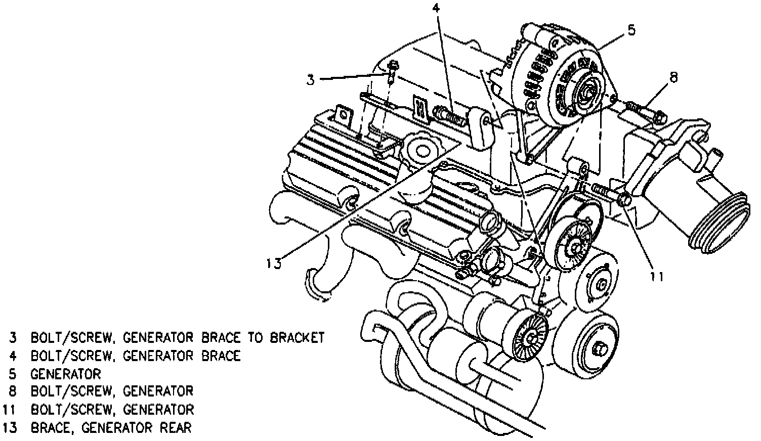 5. Remove bolts attaching alternator to drive belt tensioner.