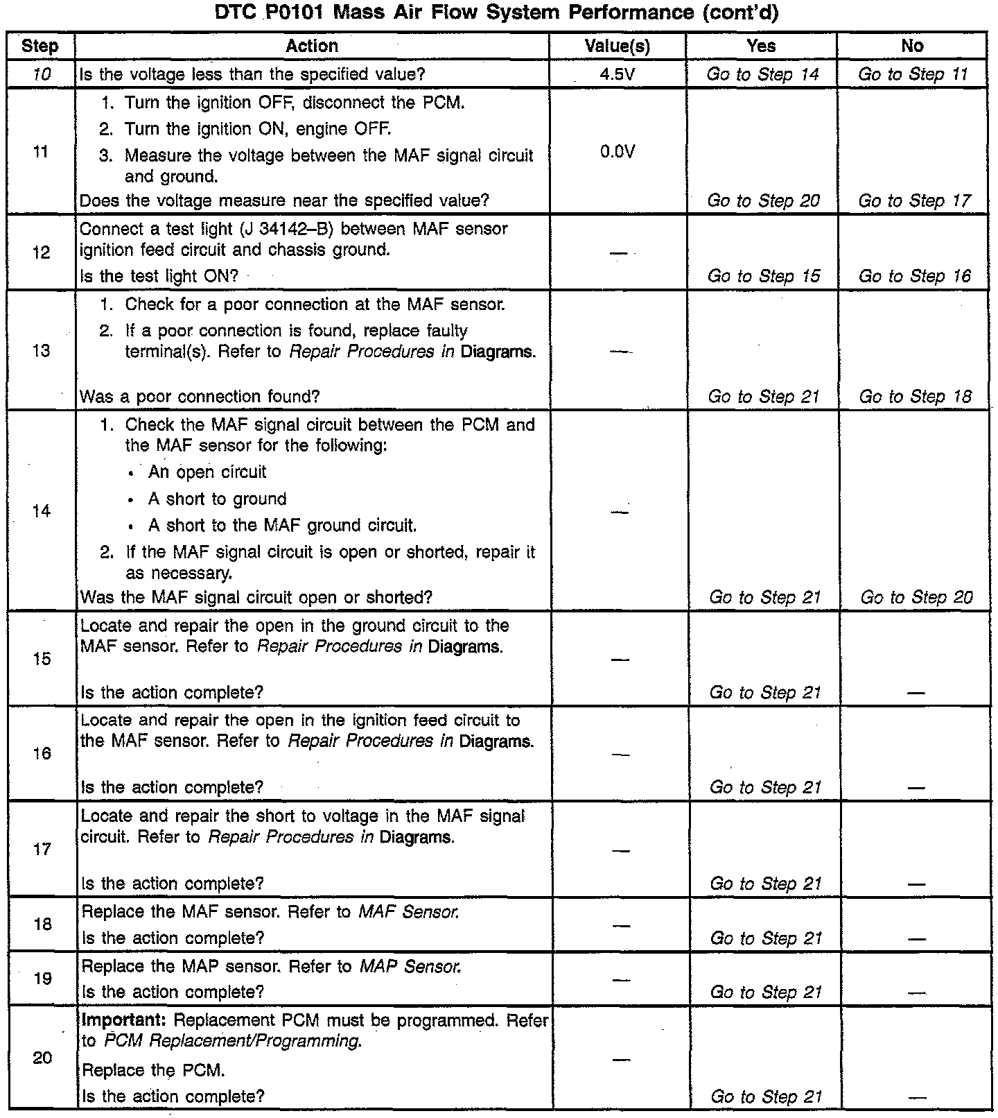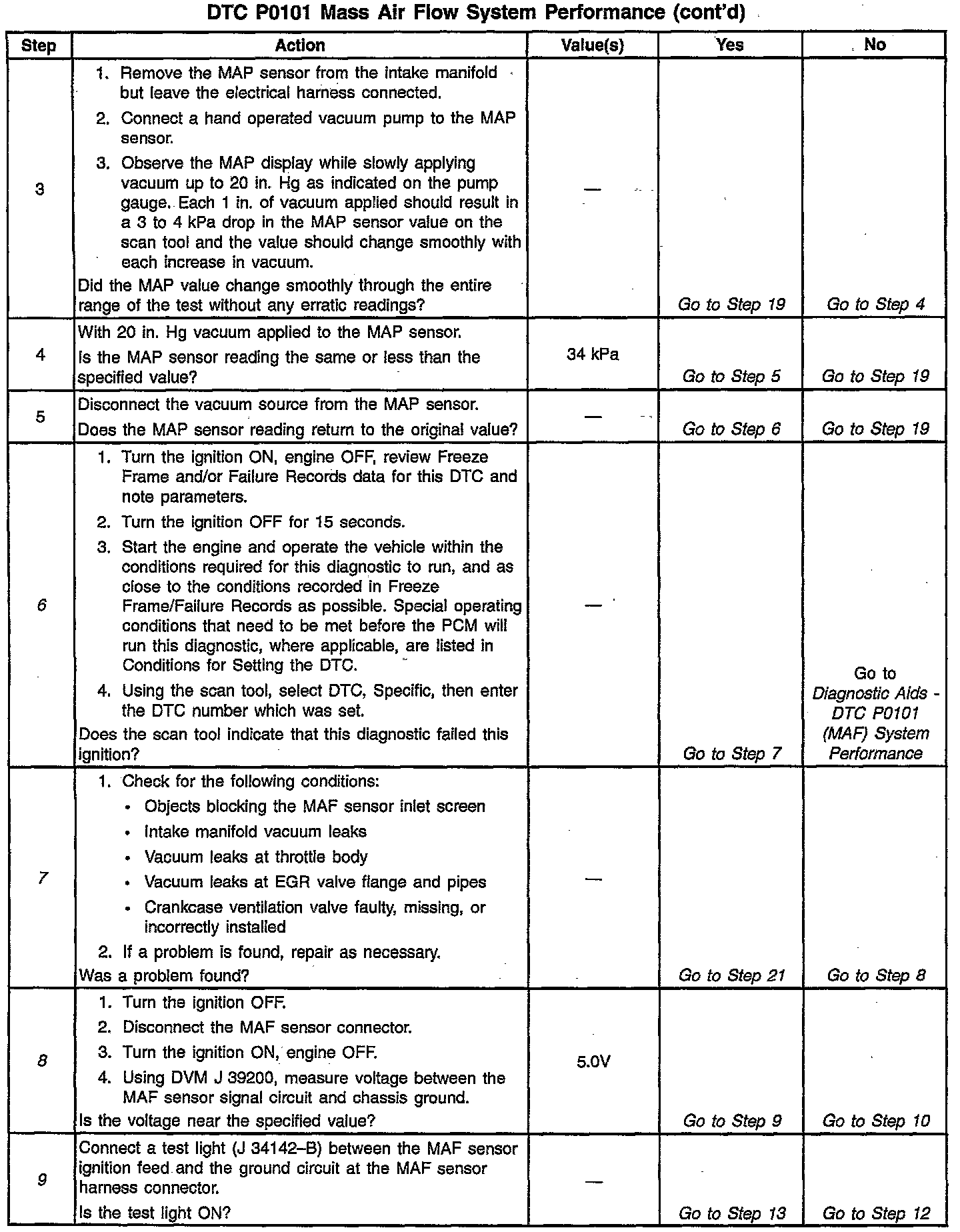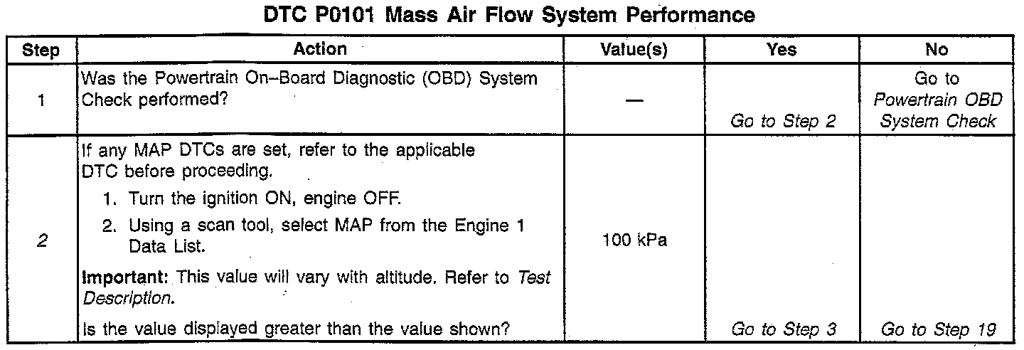2. The MAF system performance or rationality diagnostic uses the MAP sensor signal along with other inputs to calculate an expected airflow rate that is then compared to the actual measured airflow from the MAF sensor The first few steps of this table verify that the MAP sensor is working properly. Any MAP sensor DTC should be corrected first. The value shown for the MAP sensor will vary with altitude. The value will decrease by approximately 3 kPa for every 1000 feet of altitude. 100 kPa is the approximate value displayed at or near sea level.