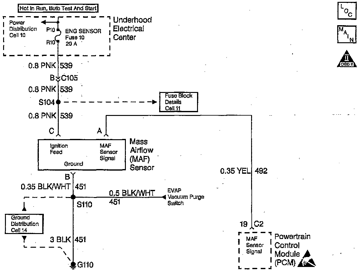 The Mass Air Flow (MAF) sensor measures the amount of air that is ingested by the engine. Direct measurement of air entering the engine is more accurate than calculating airflow from MAP, IAT and RPM (speed/density). The MAF sensor has a battery feed, ground and signal circuit.