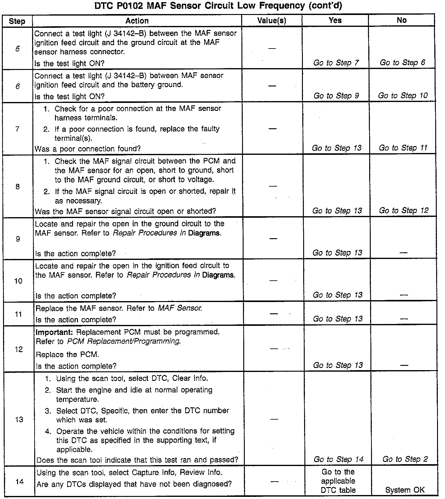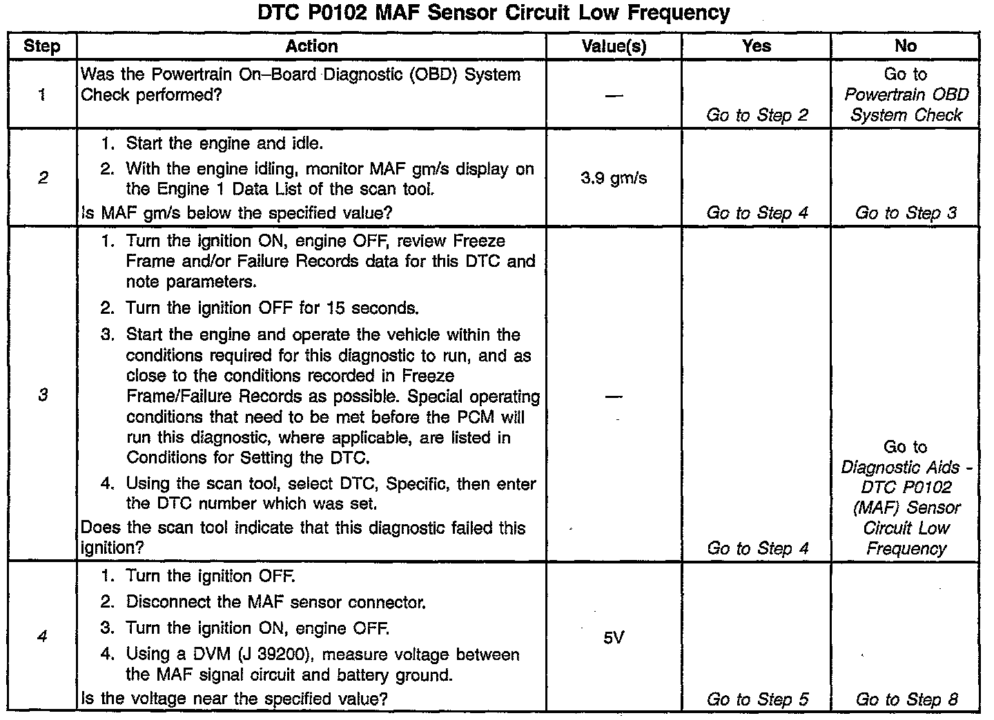 The PCM monitors the MAF sensor frequency and can determine if the sensor is stuck low, stuck high, not providing the airflow value expected for a given operating condition, or that the signal appears to be stuck based on a lack of signal variation expected during normal operation. This diagnostic checks for too low an airflow rate. When the PCM detects that the MAF sensor grams per second is below a predetermined value, this DTC will set.
