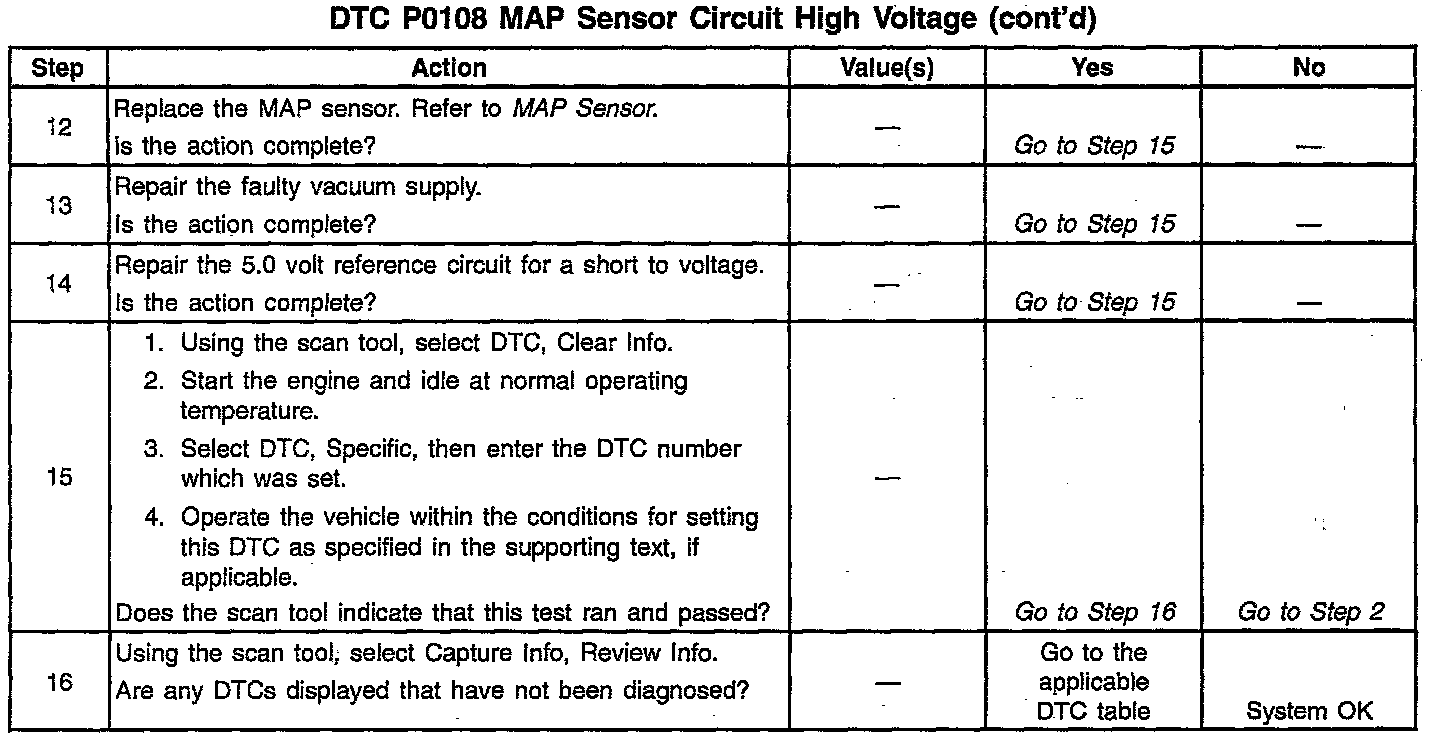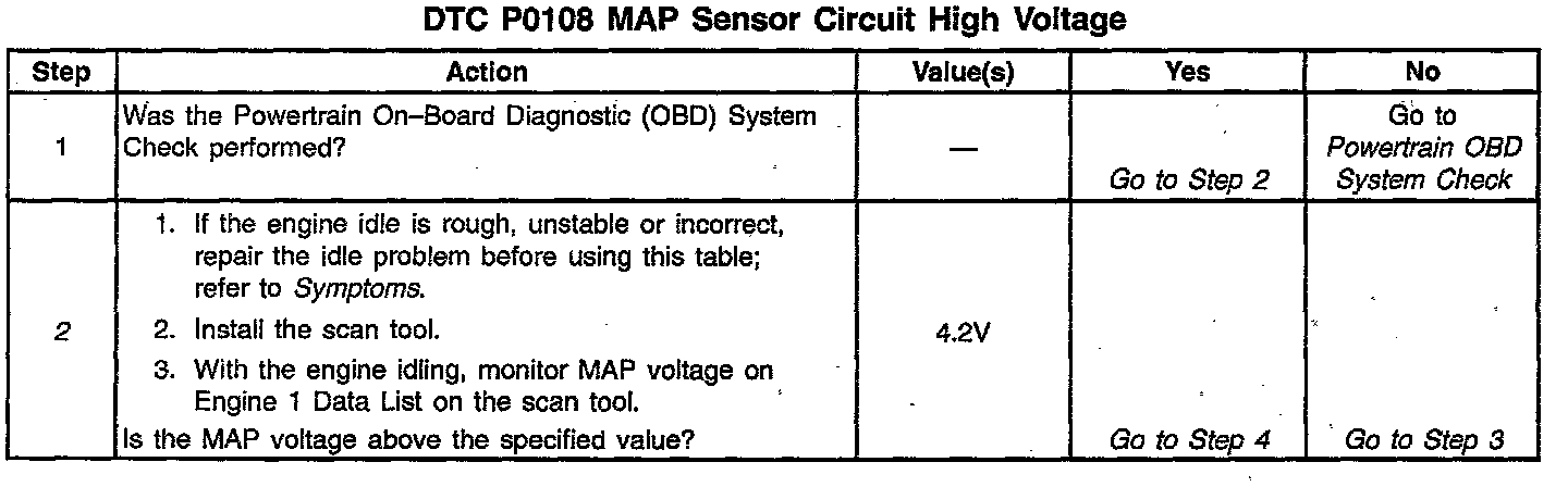 MAP sensor voltage (depending on altitude) can range from 1.0-1.5 volts at idle (high vacuum) to 4.0-4.9 volts at wide open throttle (low vacuum). When the PCM senses a signal voltage higher than the normal operating range of the sensor, this DTC will set.