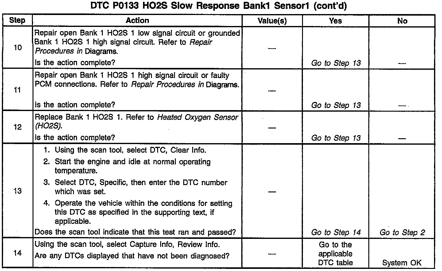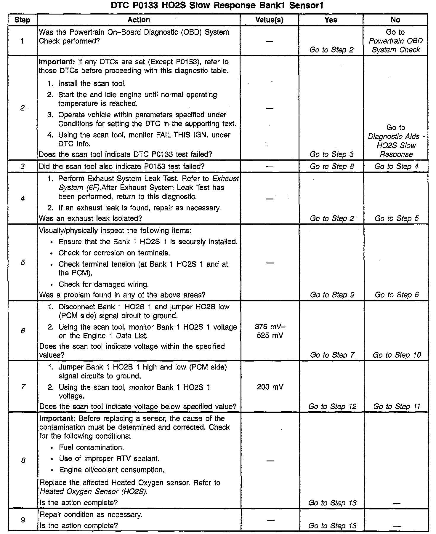 A lean to rich transition is determined when the HO2S voltage changes from less than 300 mV to greater than 600 mV. A rich to lean transition is determined when the HO2S voltage changes from more than 600 mV to less than 300 mV. An HO2S that responds too slowly is most likely defective and should be replaced.