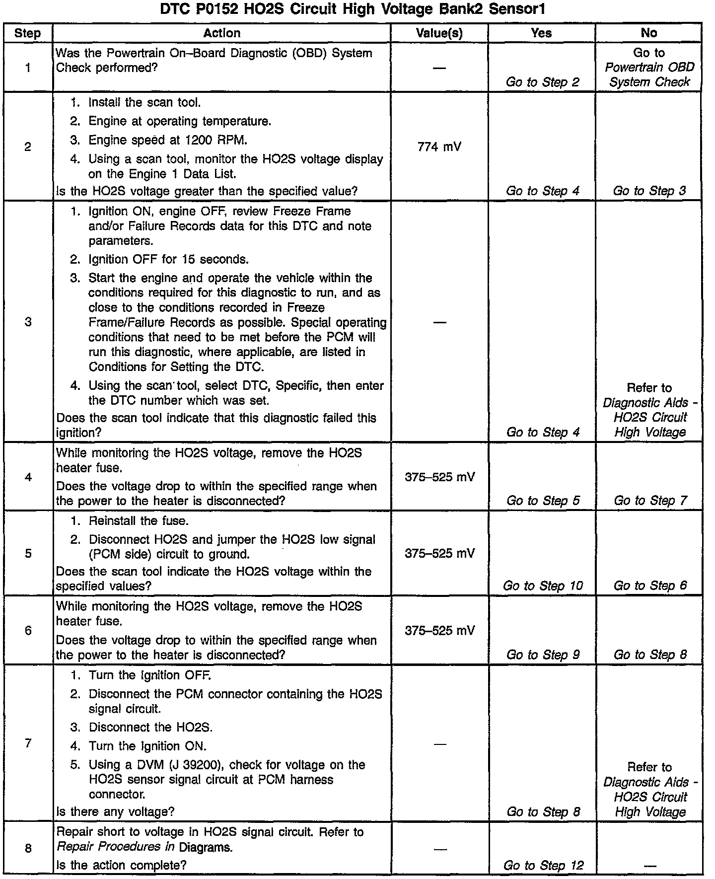 The PCM supplies a voltage of about 450 mV between the HO2S high and low signal circuits. The oxygen sensor varies the voltage over a range from about 1000 mV when the exhaust is rich, down through about 10 mV when exhaust is lean.