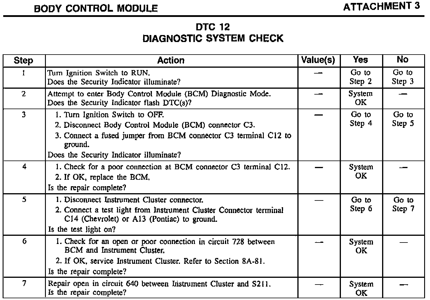 DTC 12 is always set and displayed when the BCM is in the Diagnostic Mode to indicate that the diagnostic function is in progress. if DTCs do not display when the BCM is in the Diagnostic Mode, refer to the diagnostic chart (see Attachment 3).