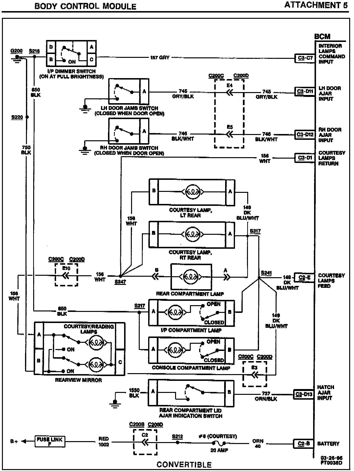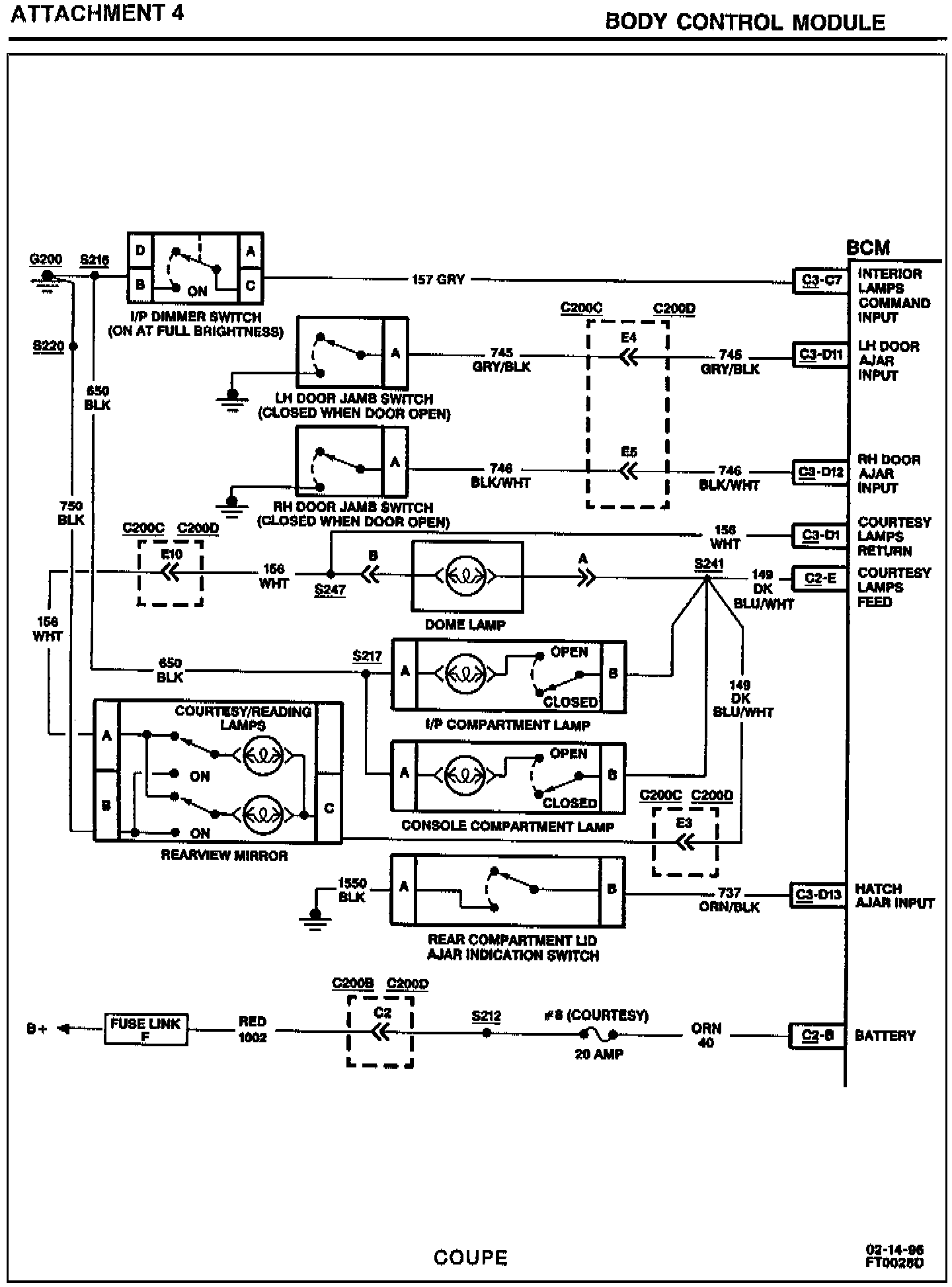 The BCM provides a 12 volt output to the courtesy lamps on circuit 149 to S241 when commanded by the I/P Dimmer Switch input, the RH or LH Door Jamb Switch inputs, or the Rear Compartment Lid Ajar Indicator Switch input. S241 distributes power to the following on the coupe and convertible models (see Attachments 4 and 5).