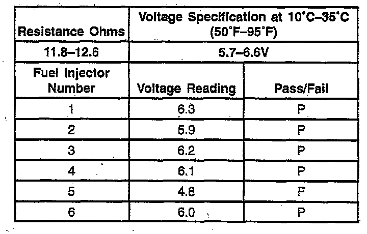 3. The first second of the voltage displayed by the DVM may be inaccurate due to the initial current surge, therefore, record the lowest voltage displayed by the DVM after the first second of the test. The voltage displayed by the DVM should be within the specified range (refer to the Example). The voltage displayed by the DVM may increase throughout the test as the fuel injector windings warm and the resistance of the fuel injector windings changes. An erratic voltage reading (large fluctuations in voltage that do not stabilize) indicates an intermittent connection within the fuel injector.