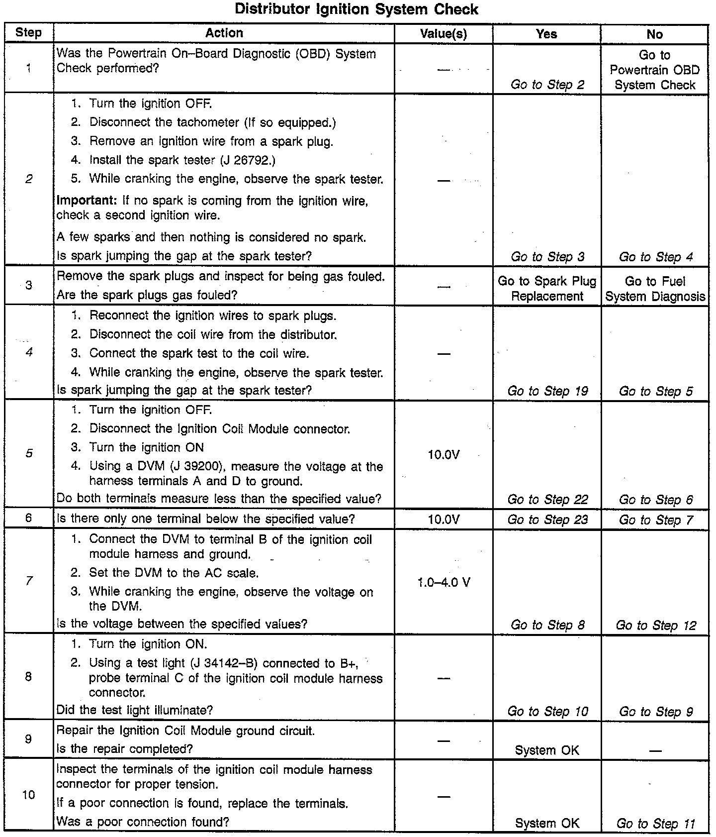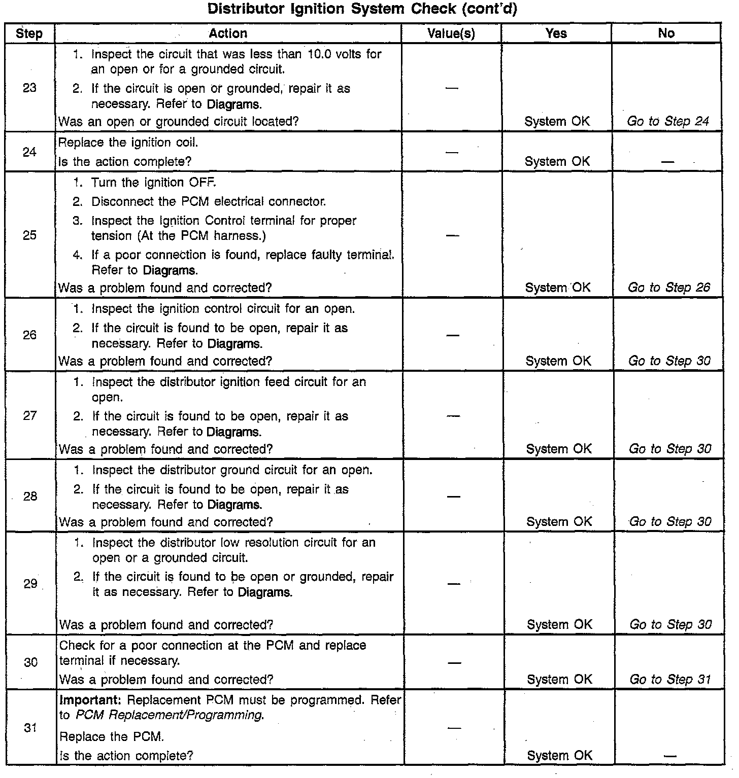 7. This check will begin to determine if the PCM is providing a signal to the ignition coil module or not. If the PCM is not providing a signal to the ignition coil module, the problem exists between the distributor and PCM.