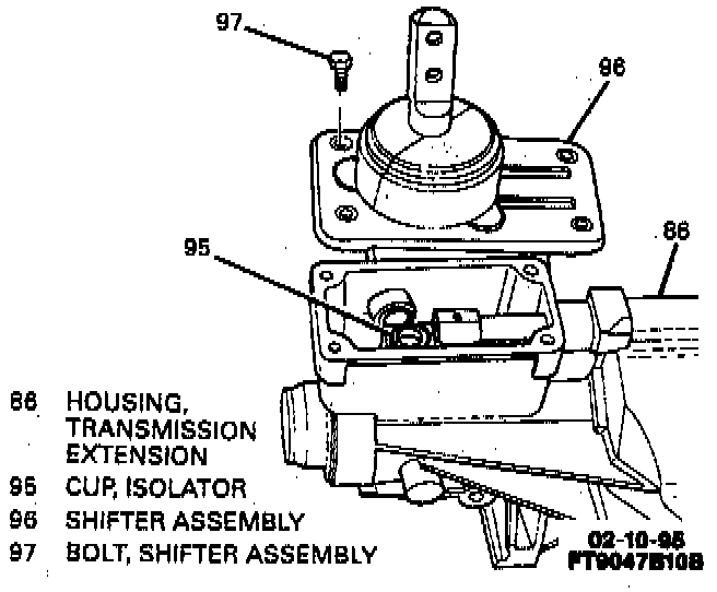 - Isolator cup (95) for wear. Replace rear offset shift lever (93), if wear is excessive or isolator cup (95) is loose.