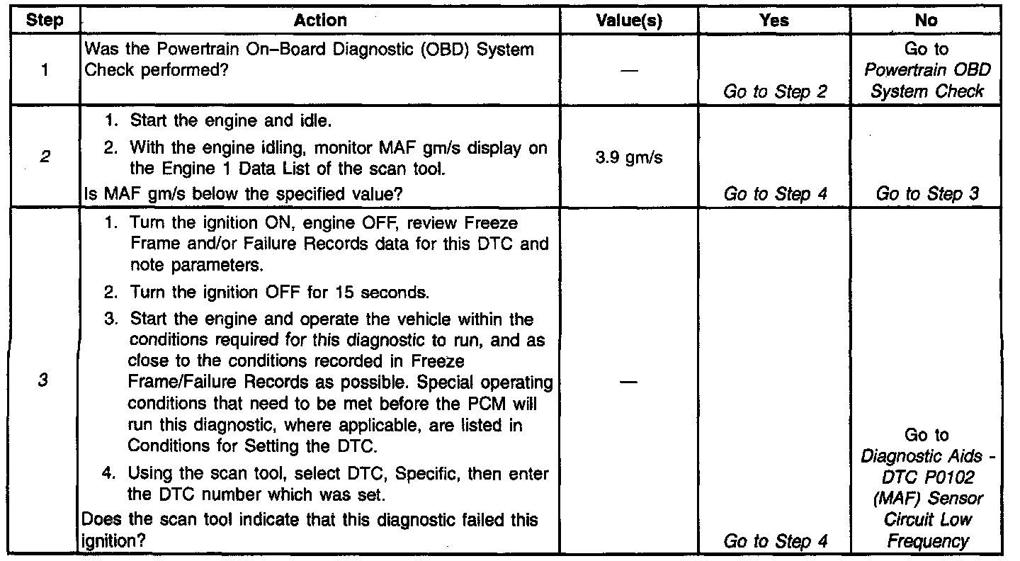 The PCM monitors the MAF sensor frequency and can determine if the sensor is stuck low, stuck high, not providing the airflow value expected for a given operating condition, or that the signal appears to be stuck based on a lack of signal variation expected during normal operation. This diagnostic checks for too low an airflow rate. When the PCM detects that the MAF sensor grams per second is below a predetermined value, this DTC will set.