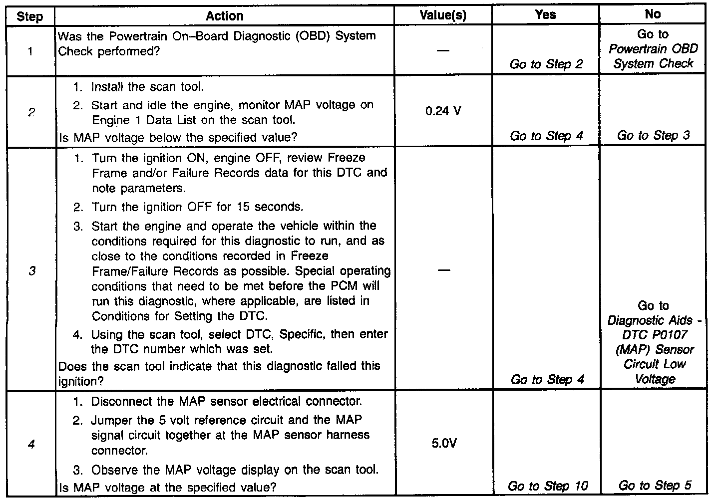 MAP sensor voltage (depending on altitude) can range from 1.0-1.5 volts at idle (high vacuum) to 4.0 - 4.9 volts at wide open throttle (low vacuum). When the PCM senses a signal voltage lower than the normal operating range of the sensor, this DTC will set.