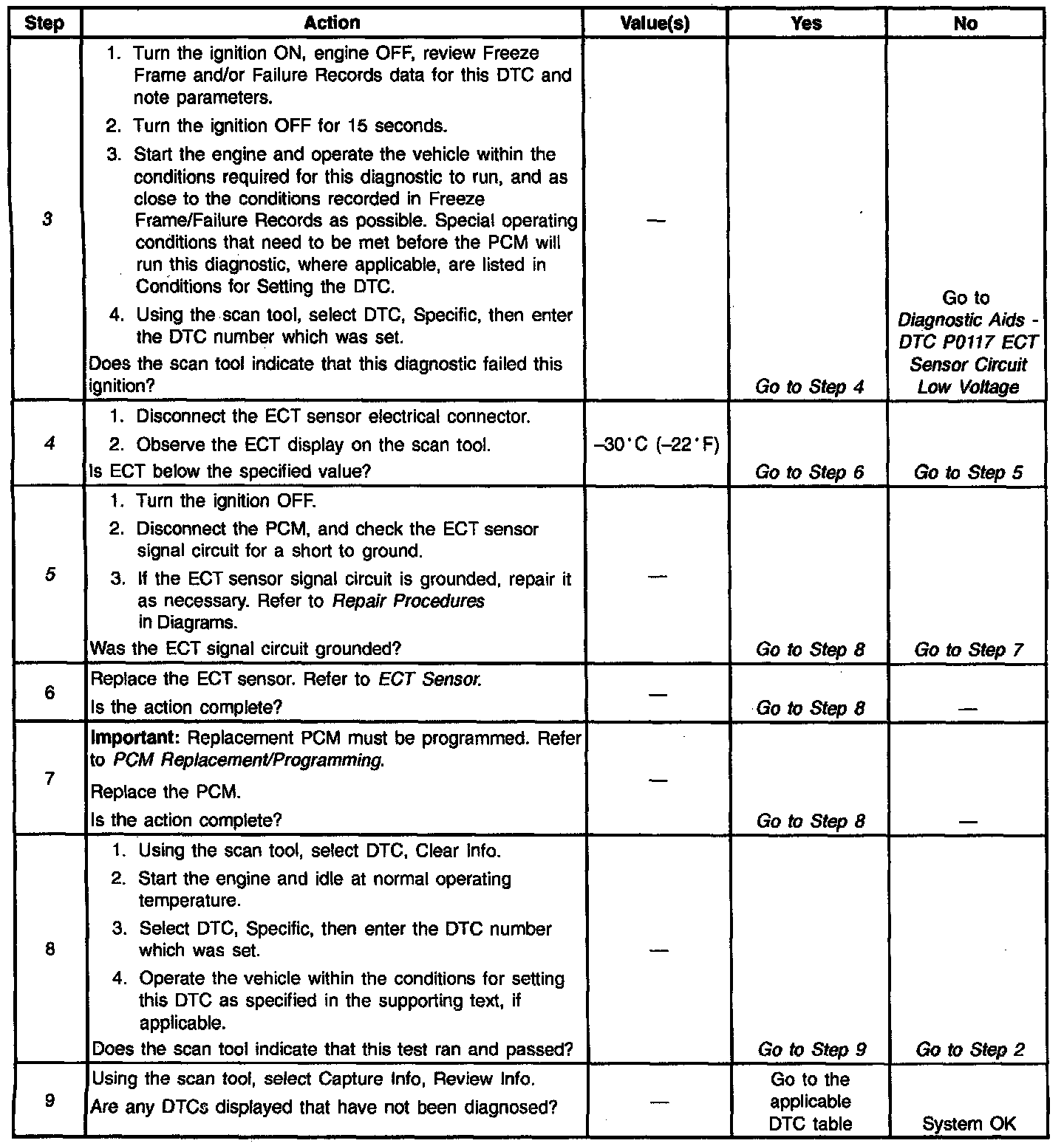 4. If the engine coolant temperature goes below -30°C (-22°F), indicates the PCM and ECT wiring are OK.