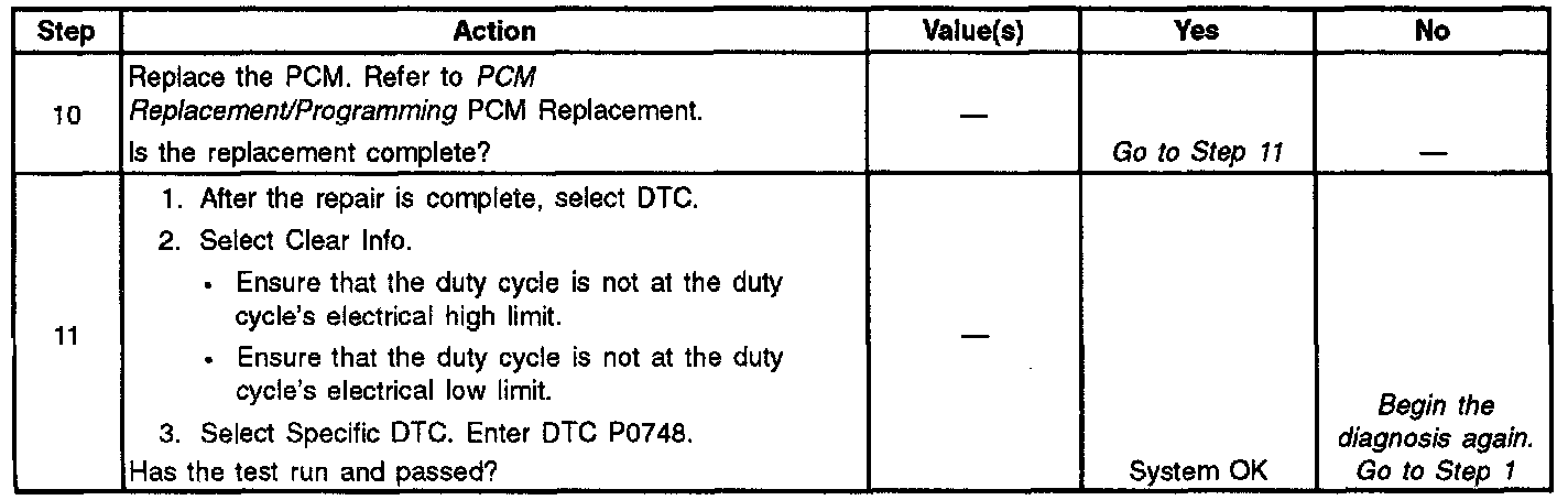 The Pressure Control Solenoid (PC Sol.) Valve is a PCM-controlled device that regulates the transmission line pressure. The PCM compares the TP voltage, the engine RPM, and other inputs in order to determine the appropriate line pressure for a given load. The PCM regulates the pressure by applying a varying amperage to the PCS. The applied amperage varies from 0.1 to 1.1 amps. The applied amperage is monitored by the PCM. When the PCM detects a continuous open or a continuous short to ground in the PCS circuit, then DTC P0748 sets. DTC P0748 is a type D DTC.