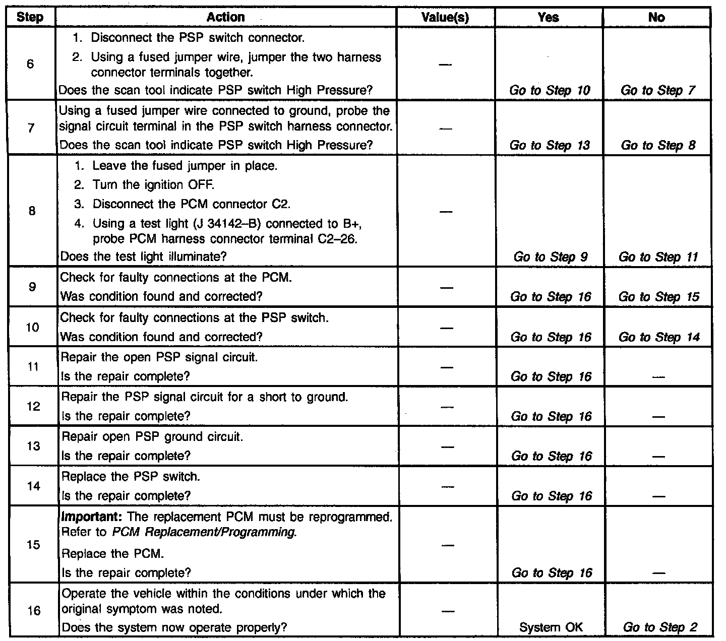 The Power Steering Pressure (PSP) switch is a normally open pressure switch located in the high pressure (outlet) hose of the power steering system. The PCM applies a voltage (about 12.0 Volts) to the sensor. When power steering pressure is low the PSP switch is open and the PCM senses high signal voltage (low engine load). When power steering - pressure is high, such as during parking maneuvers, etc., the PSP switch closes, and the PCM senses low signal voltage (high engine load). The PCM will increase the idle air rate and retard the timing to compensate for the additional load on the engine.