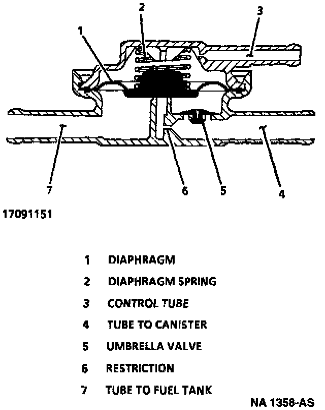 This system uses an in-line Evaporative Emissions (EVAP) pressure control valve as a pressure relief valve. When vapor pressure in the tank exceeds approximately 5 kPa (0.7 psi) the diaphragm valve opens, allowing vapors to vent to the canister. A 1.14 mm (0.045 inch) orifice in the passage leading to the canister tube causes pressure to drop slowly, preventing the valve from oscillating (buzzing). When the tank pressure drops below 5 kPa (0.7 psi), the valve closes causing vapors to be held in the fuel tank.