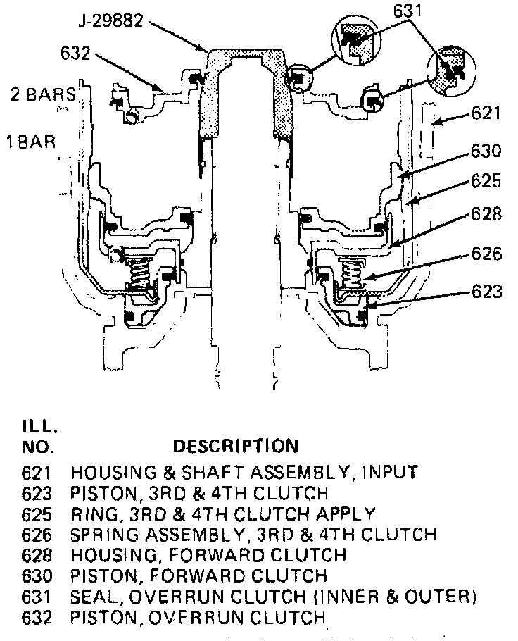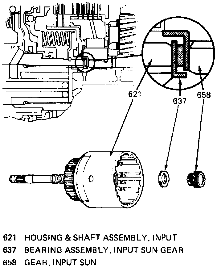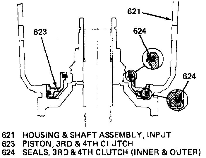 24. Install overrun clutch piston with hub facing upward. If all parts are properly seated at this point, the overrun piston hub will be approximately 3/16 inch below the snap ring groove in the input housing hub.