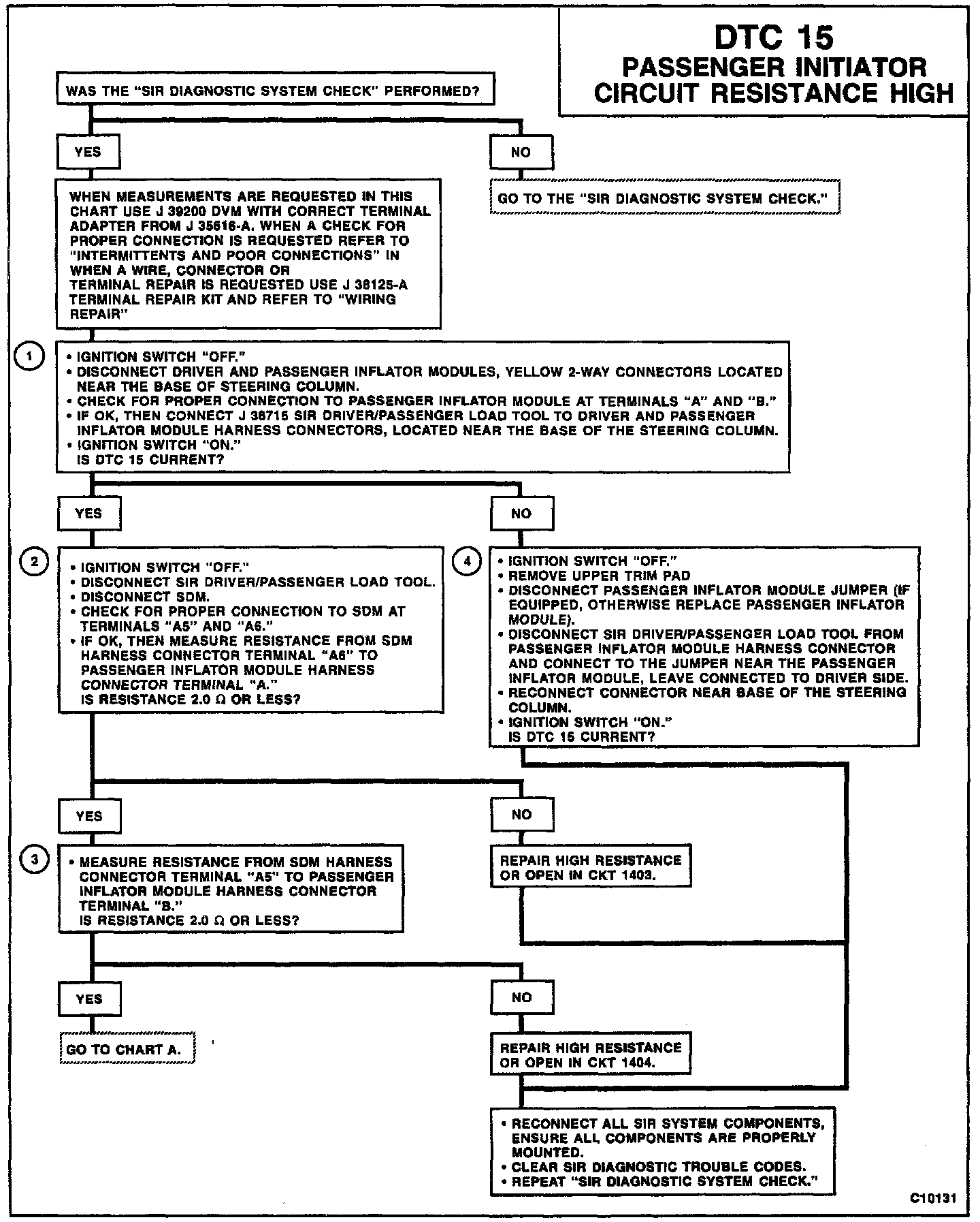 An intermittent condition is likely to be caused by a poor connection at the passenger inflator module harness connector terminals "A" and "B," SDM terminals "A5" and "A6," or a poor wire to terminal connection in CKT 1403 or CKT 1404. This test for this diagnostic trouble code is only run while the "AIR BAG" warning lamp is performing the bulb check, unless DTC 17 or DTC 26 is detected. When a scan tool "Clear Codes" command is issued and the malfunction is still present, the DTC will not reappear until the next ignition cycle.