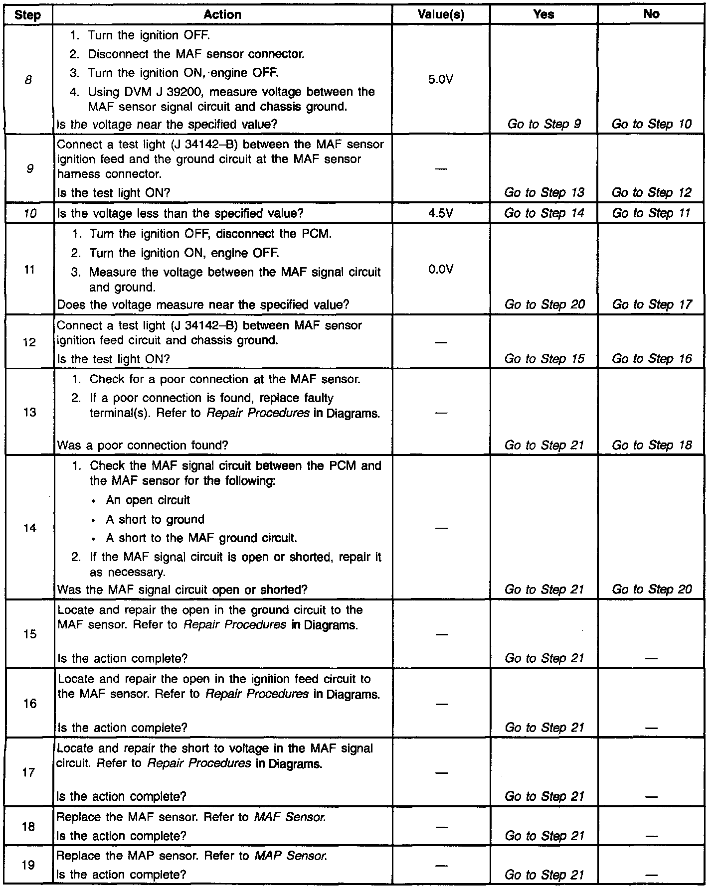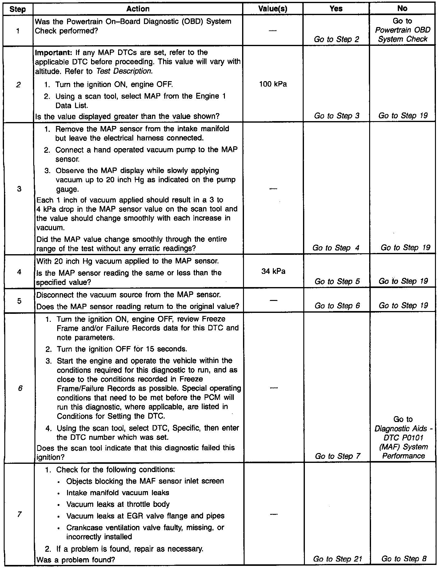 2. The MAF system performance or rationality diagnostic uses the MAP sensor signal along with other inputs to calculate an expected airflow rate that is then compared to the actual measured airflow from the MAF sensor. The first few steps of this table verity that the MAP sensor is working properly. Any MAP sensor DTC should be corrected first. The value shown for the MAP sensor will vary with altitude. The value will decrease by approximately 3 kPa for every 1000 feet of altitude. 100 kPa is the approximate value displayed at or near sea level.