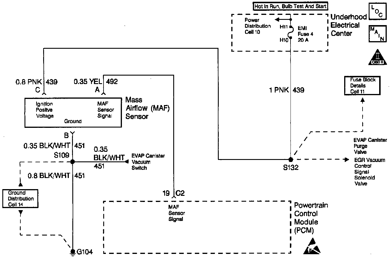 The Mass Air Flow (MAF) sensor measures the amount of air that is ingested by the engine. Direct measurement of air entering the engine is more accurate than calculating airflow from MAP, IAT and RPM (speed/density). The MAF sensor has a battery teed, ground and signal circuit.