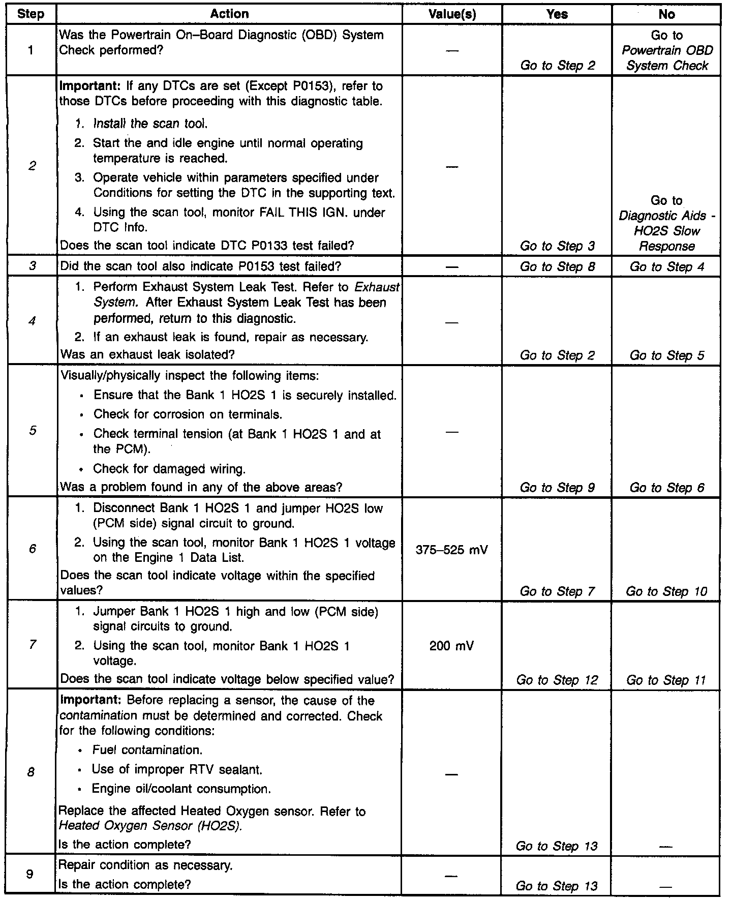 A lean to rich transition is determined when the HO2S voltage changes from less than 300 mV to greater than 600 mV. A rich to lean transition is determined when the HO2S voltage changes from more than 600 mV to less than 300 mV. An HO2S that responds too slowly is most likely defective and should be replaced.