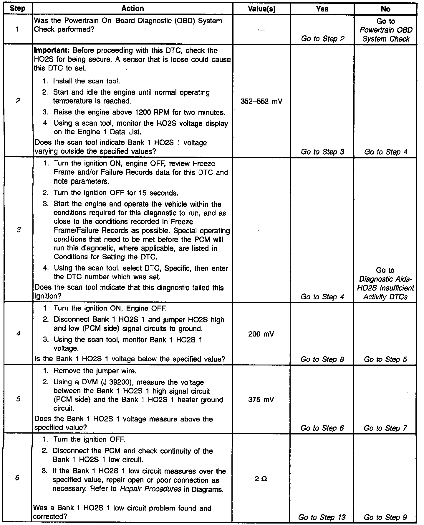 The PCM supplies a voltage of about 450 mV between the Heated Oxygen Sensor (HO2S) high and low signal circuits. The oxygen sensor varies the voltage over a range from about 1000 mV when the exhaust is rich, down through about 10 mV when exhaust is lean.