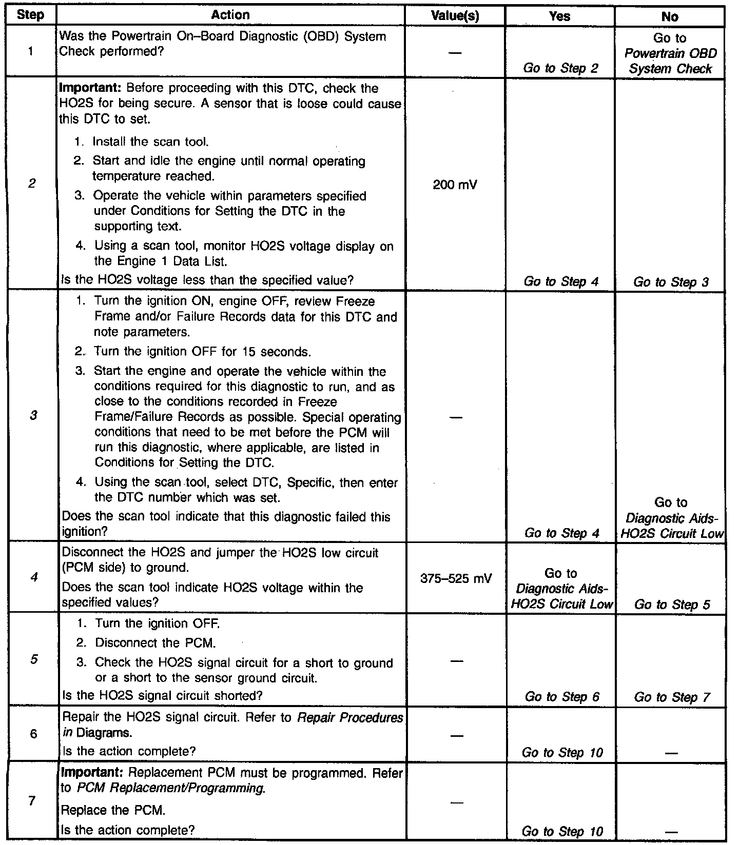 The PCM supplies a voltage of about 450 mV between the Heated Oxygen Sensor (HO2S) high and low signal circuits. The oxygen sensor varies the voltage over a range from about 1000 mV when the exhaust is rich, down through about 10 mV when exhaust is lean.
