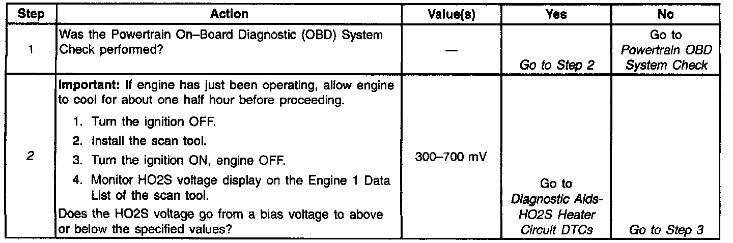2. The engine must be allowed to cool, as the HO2S maybe at operating temperature and no drop or rise in HO2S voltage would occur. If the HO2S voltage stays between 300700 mV indicates the HO2S heater is inoperative. For any test that requires probing the PCM or a component harness connector, must use the Connector Test Adapter Kit J 35616-A. Using this kit will prevent damage to the harness connector terminals.