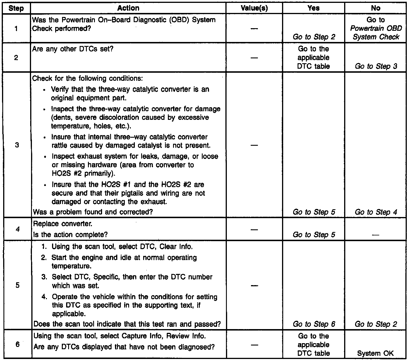 In order to maintain a reasonably low emissions of Hydrocarbons (HO), Carbon Monoxide (CO), and Oxides of Nitrogen (NOx), a three way catalytic converter is used. The catalyst within the converter promotes a chemical reaction which oxidizes the HC and CO present in the exhaust gas. This reaction converts them into harmless water vapor and carbon monoxide. The catalyst also reduces NOx, converting it to nitrogen. The PCM has the capability to monitor this process using Bank 1 HO2S #2. Bank 1 HO2S #2, located in the exhaust stream past the three way catalytic converter, produces an output signal which indicates the oxygen storage capacity of the catalyst. This determines the catalysts ability to convert exhaust emissions effectively. If the catalyst is functioning correctly, the Bank 1 HO2S #2 signal will be far less active than that produced by Bank 1 HO2S #1. If a problem exists which causes the PCM to detect excessive Bank 1 HO2S #2 activity outside of an acceptable range for an extended period of time, the PCM will set DTC P0420. This indicates that the three way catalytic converters oxygen storage capacity is below a threshold considered acceptable.