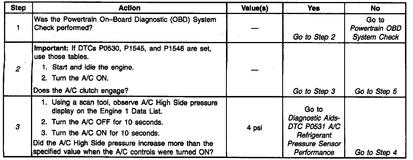 The PCM monitors the A/C clutch status circuit and can determine when the clutch has cycle from ON to OFF. As the A/C compressor cycles OFF, the PCM will record A/C refrigerant pressure from the A/C refrigerant pressure sensor. It the PCM does not detect an increase from the A/C refrigerant pressure sensor when the A/C clutch cycles back ON, a DTC P0531 will set. This condition can occur if the A/C refrigerant pressure sensor is fixed at one value.