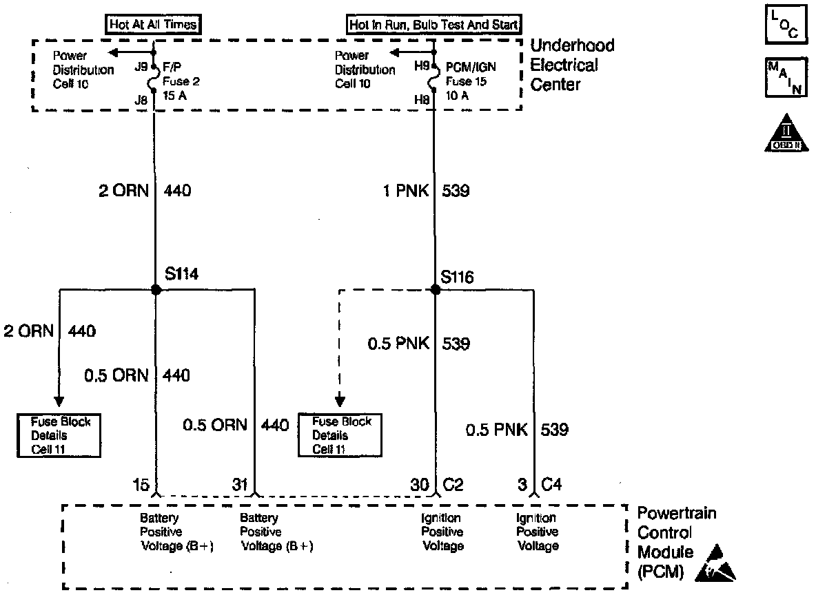 Circuit 539 is the ignition voltage feed for the PCM. Circuit 440 is the battery voltage feed for the PCM.