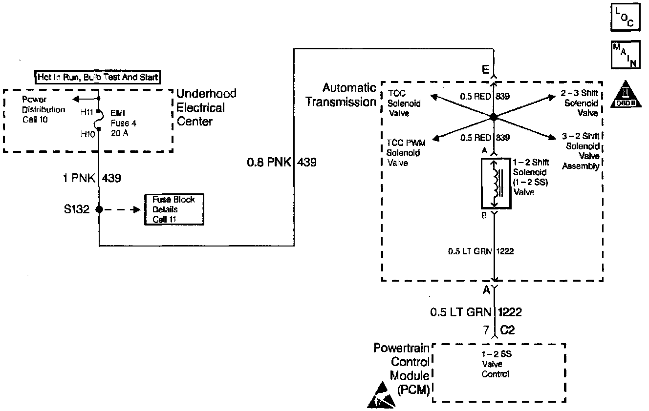 The solenoid is a normally-open exhaust valve. The combination of the 2-3 Shift Solenoid Valve and the 1-2 SS Valve allows four different shifting combinations. The solenoid attaches to the control valve body within the transmission. Circuit 439 supplies ignition voltage directly to the 1-2 SS Valve. The PCM controls the solenoid by providing a ground path through circuit 1222.