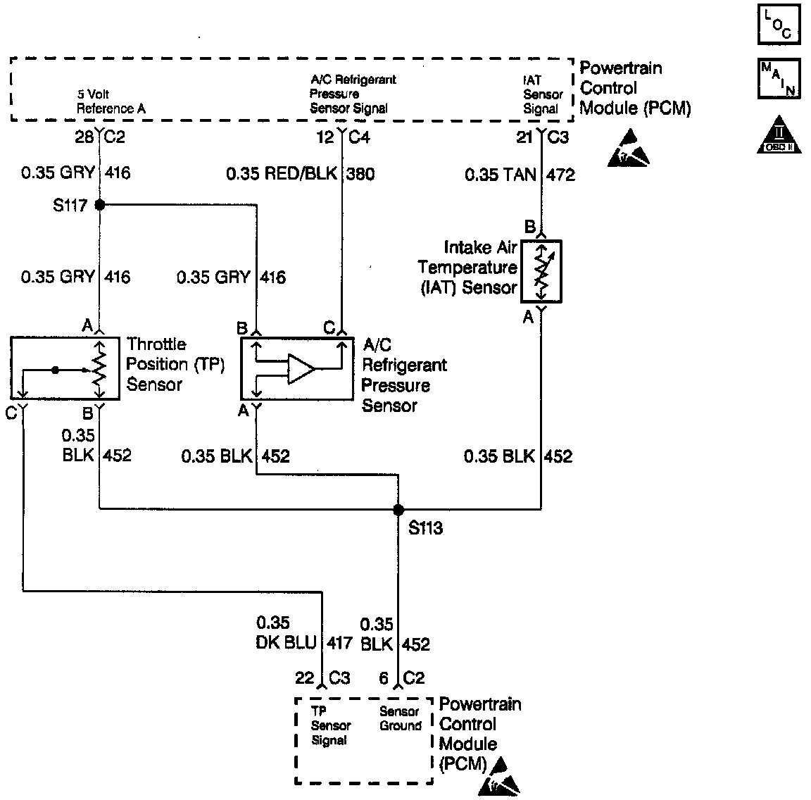 When the intake air is cold, the sensor (thermist9r) resistance is high, and the PCMs signal voltage is only pulled down a small amount through the sensor to ground. Therefore, the PCM will sense a high signal voltage (low temperature). When the intake air is warm, the sensor resistance is low, and the signal voltage is pulled down a greater amount. This causes the PCM to sense a low signal voltage (high temperature).