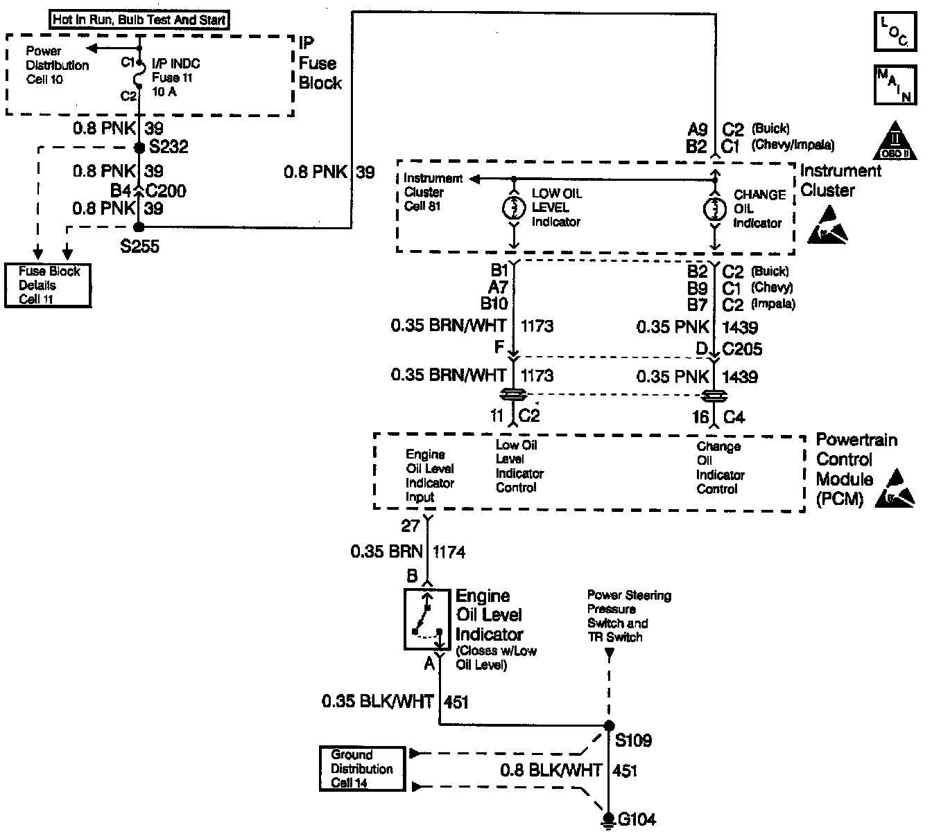 Ignition voltage is supplied directly to the Change Oil lamp The PCM controls the lamp by grounding the control circuit via an internal switch called a driver. The primary function of the driver is to supply the ground for the component being controlled. Each driver has a fault line which is monitored by the PCM. When the PCM is commanding a component ON, the voltage of the control circuit should be low (near 0 volts). When the PCM is commanding the control circuit to a component OFF, the voltage potential of the circuit should be high (near battery voltage). If the fault detection circuit senses a voltage other than what is expected, the fault line status will change causing the DTC to set.