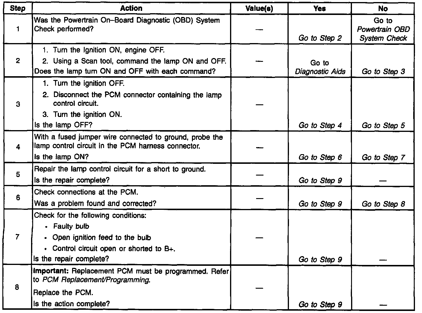 8. If no trouble is found in the control circuit or the connection at the PCM, the PCM may be faulty, however, this is an extremely unlikely failure.