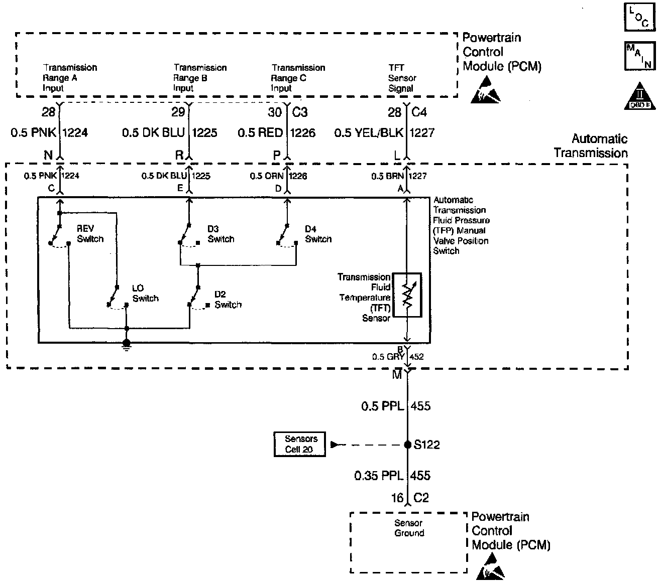 The Transmission Fluid Temperature (TFT) sensor is a negative coefficient thermistor within the Automatic Transmission Fluid Pressure (TFP) Manual Valve Position Switch. The TFT sensor controls the signal voltage to the PCM. The PCM supplies a 5 volt reference to the sensor on circuit 1227.