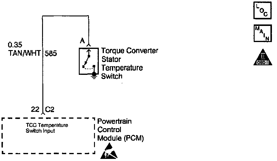 The torque converter stator temperature switch is a normally-open, temperature-sensitive switch which sends a signal to the PCM to begin action in order to cool the torque converter. At transmission fluid temperatures of 164°C (327°F) or higher, the switch closes and the signal to the PCM changes to 0 volts. The torque converter stator temperature switch is a single lead switch that grounds through the transmission fluid cooler pipes.