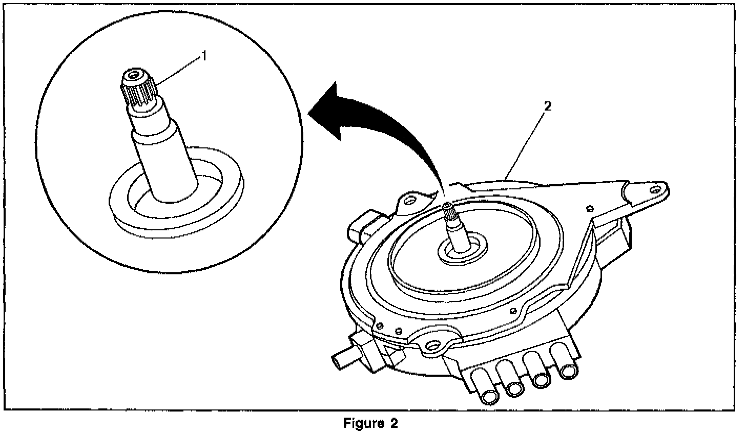 2. Opti-Spark Distributor I (Splined Drive - WITHOUT positive vent system) can be identified by the splined pin drive (1), or the lack of intake manifold vacuum hose connection and air intake duct hose connection. Refer to Figure 2.
